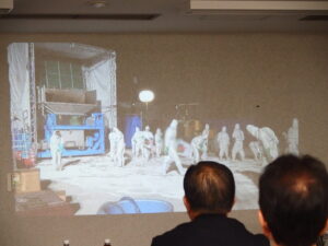 本題に入りナイスポーク会菅谷知男会長代理から「豚熱発生に伴うレンダリング装置の活用について」映像を交え報告がありました。自らの農場での発生から、殺処分、レンダによる処理、焼却と